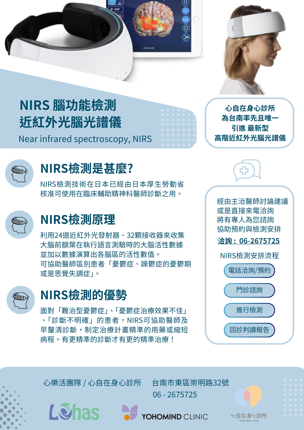 利用24道近紅外光發射器、32顆接收器來收集大腦前額葉在執行語言測驗時的大腦活性數據並加以數據演算出各腦區的活性數值,可協助醫師區別患者